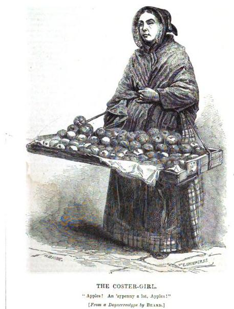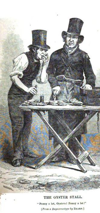 Perhaps the most intriguing section of London Labour and the London Poor discusses the lives of the costermongers — street sellers of food. The costermongers in the poorer sections of London sold a vast array of wares — potatoes, ham sandwiches, oranges and nuts, watercress, hot green peas and sheep trotters being just a few of the delicacies offered by them. But their delicacies were not as savory as they seem: Mayhew writes that the costermongers often played tricks on their customers, adulterating their wares in unsavory ways. He reports that the “more honest costermongers will throw away fish when it is unfit for consumption; less scrupulous dealers, however, only throw away what is utterly unsaleable; but none of them fling away the dead eels, though their prejudice against such dead fish prevents their indulging in eel pies.” “The dead eels,” Mayhew continues, “are mixed with the living often in the proportion of 20 lbs dead to 5 lbs alive, equal quantities of each being accounted very fair dealing.” After all, as a street fish dealer said to Mayhew, “I don’t know why dead eels should be objected to. The aristocrats don’t object to them. Nearly all fish is dead before it’s cooked and why not eels?”